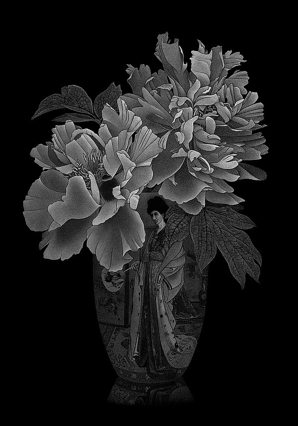 Tree Peonies in a Vase Decorated with a Depiction of McNeill Whistler’s “Princess from the Land of Porcelain”
