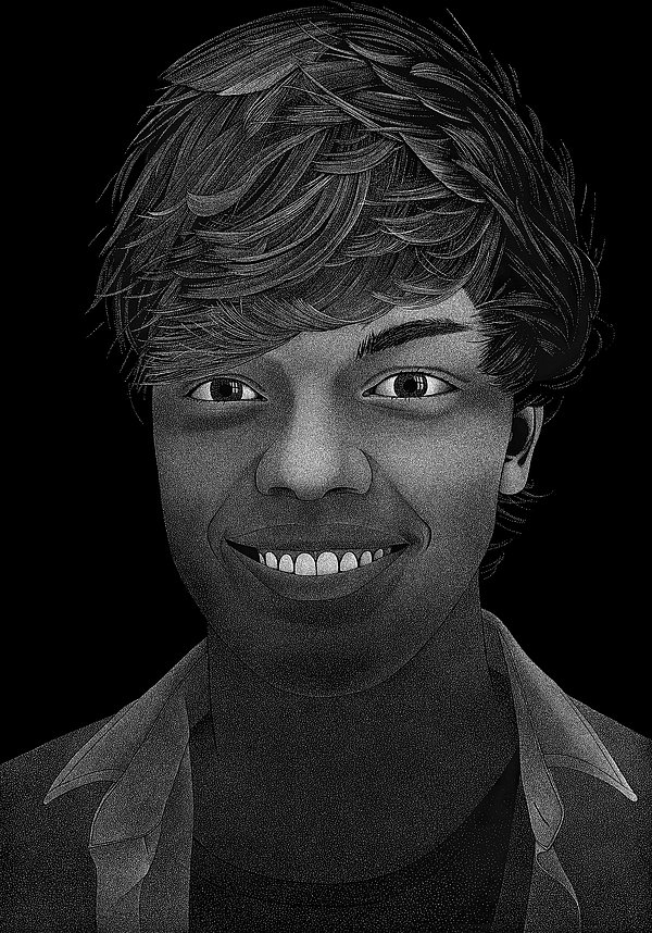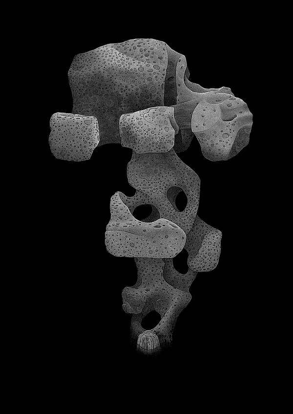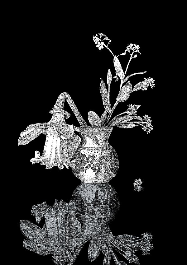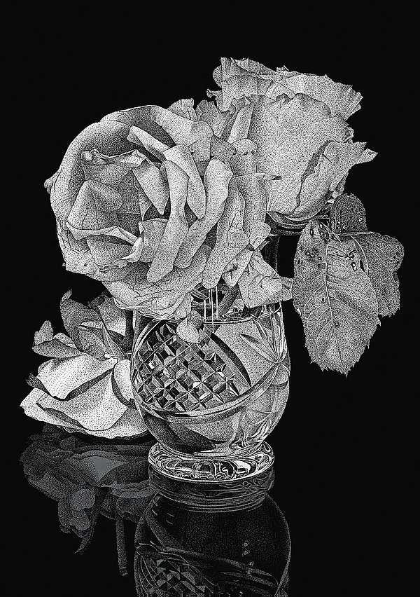 Thilo Westermann is acclaimed for his reverse glass paintings, prints, drawings, and photomontages. Regarding reverse glass painting, his process begins with a blackened glass plate, from which he carefully etches an image dot by dot. After its completion, the reverse glass painting is scanned, enlarged several times, and printed. The large-scale printed image reveals the original motif to be a multitude of dots, and each dot becomes recognizable as the result of a unique action. Consequently, the original image becomes superimposed by the individual artistic strokes used in its creation.