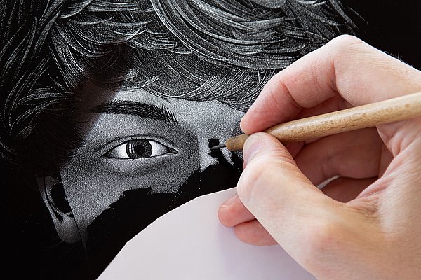 Thilo Westermann etching the motif of his reverse glass painting “Leelah Alcorn” dot by dot from the blackened back surface of a sheet of glass © VG Bild-Kunst